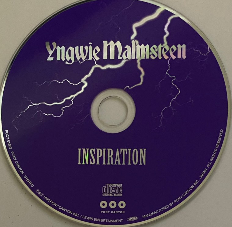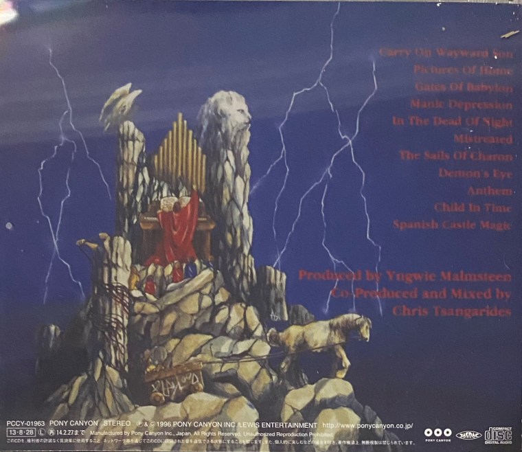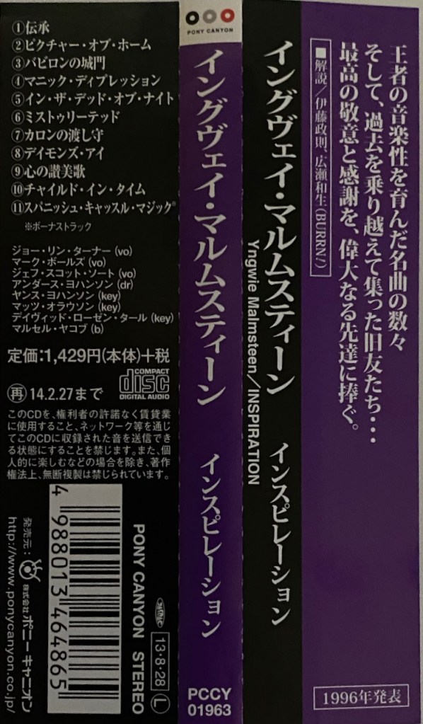 Yngwie Malmsteen brought back his first three singers for his next album which was a tribute album of all the songs that inspired Yngwie to do what he does. The aptly titled, ‘Inspiration’, is his ninth studio album and was released on October 14, 1996. The album charted in Finland and in Sweden but nowhere else that I can find. It did go Gold in Japan selling over 100,000 copies. It has been reissued a couple times over the years, but my copy is the original Japanese released on Pony Canyon from 1996 with OBI strip and booklet written all in Japanese.