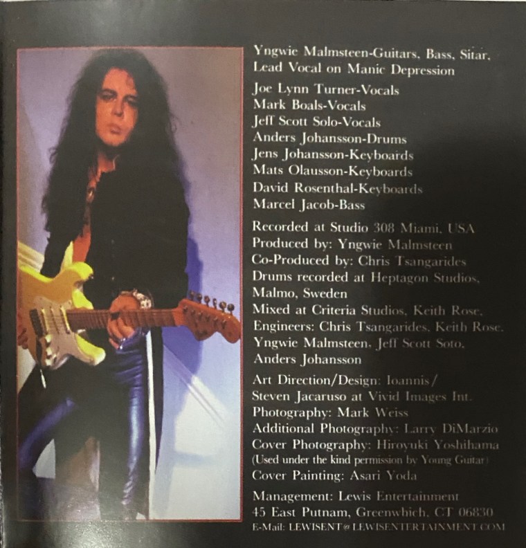 The singers on the album are Joe Lynn Turner, Mark Boals and the reason we are here, Jeff Scott Soto. If you remember after ‘Marching Out’ when Jeff left the band yet again, I told you he would pop back in the Yngwie Universe. Joe and Jeff get 3 songs each while Mark gets 4 on the album. Yngwie even handles the vocals on one song which give us the 11 songs in total. The Japanese Edition that I has a bonus track that gives us 11 tracks in total. The normal release of the album only had 10 tracks.
